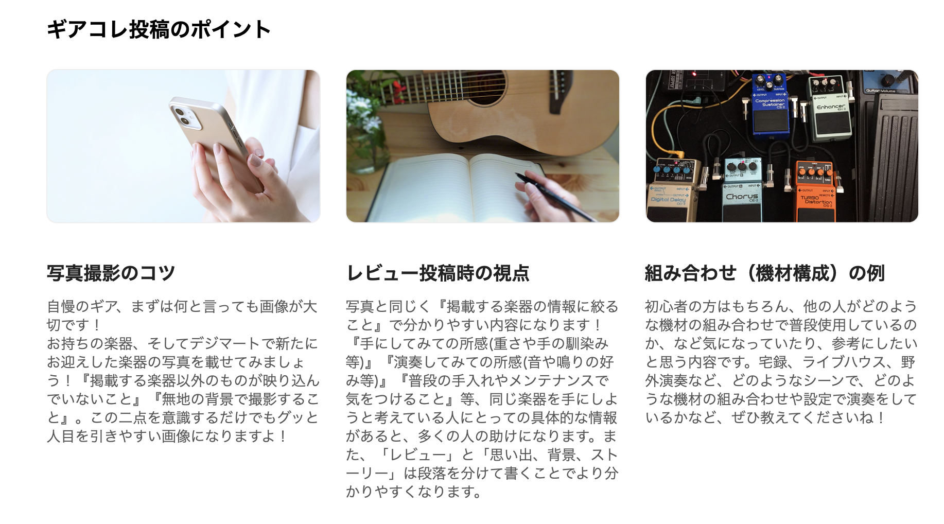 ギアコレは、自分の楽器の写真を撮影し、レビューを投稿したり、機材構成を紹介したりできるようです。