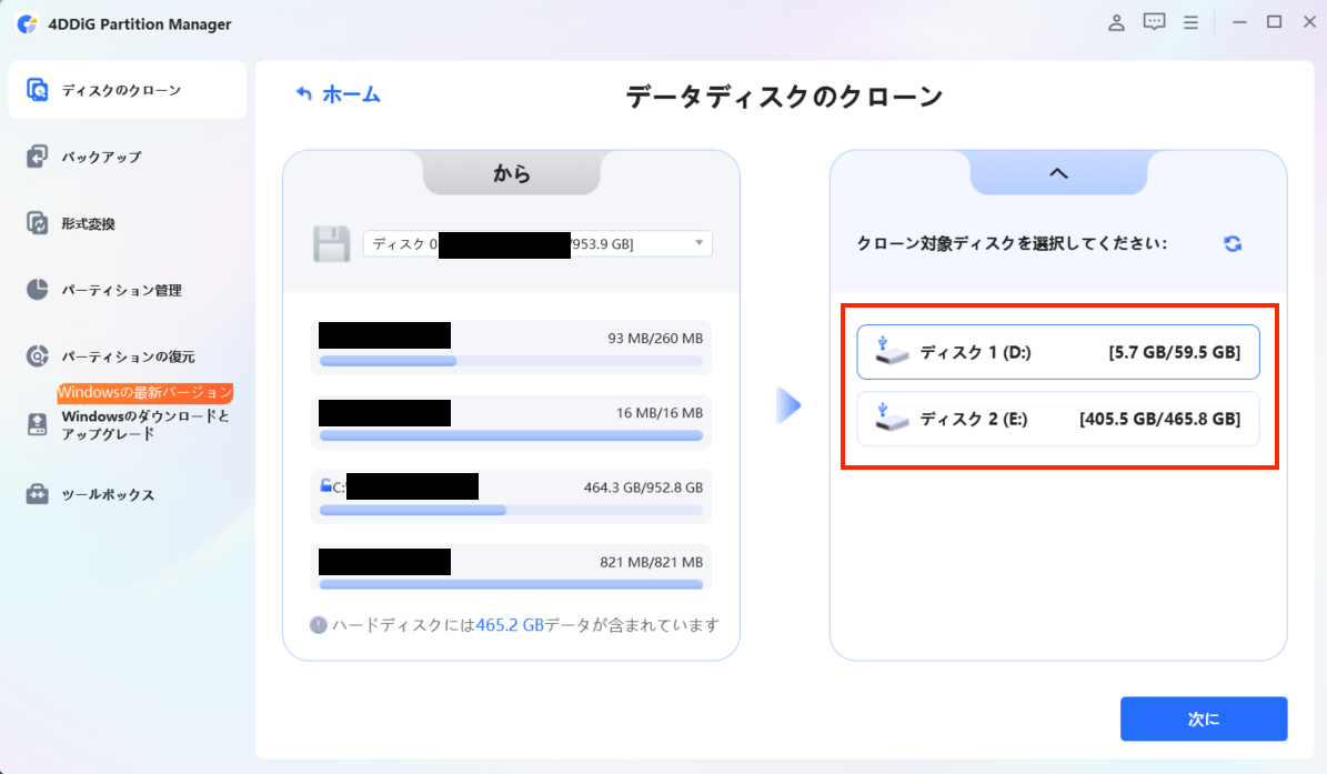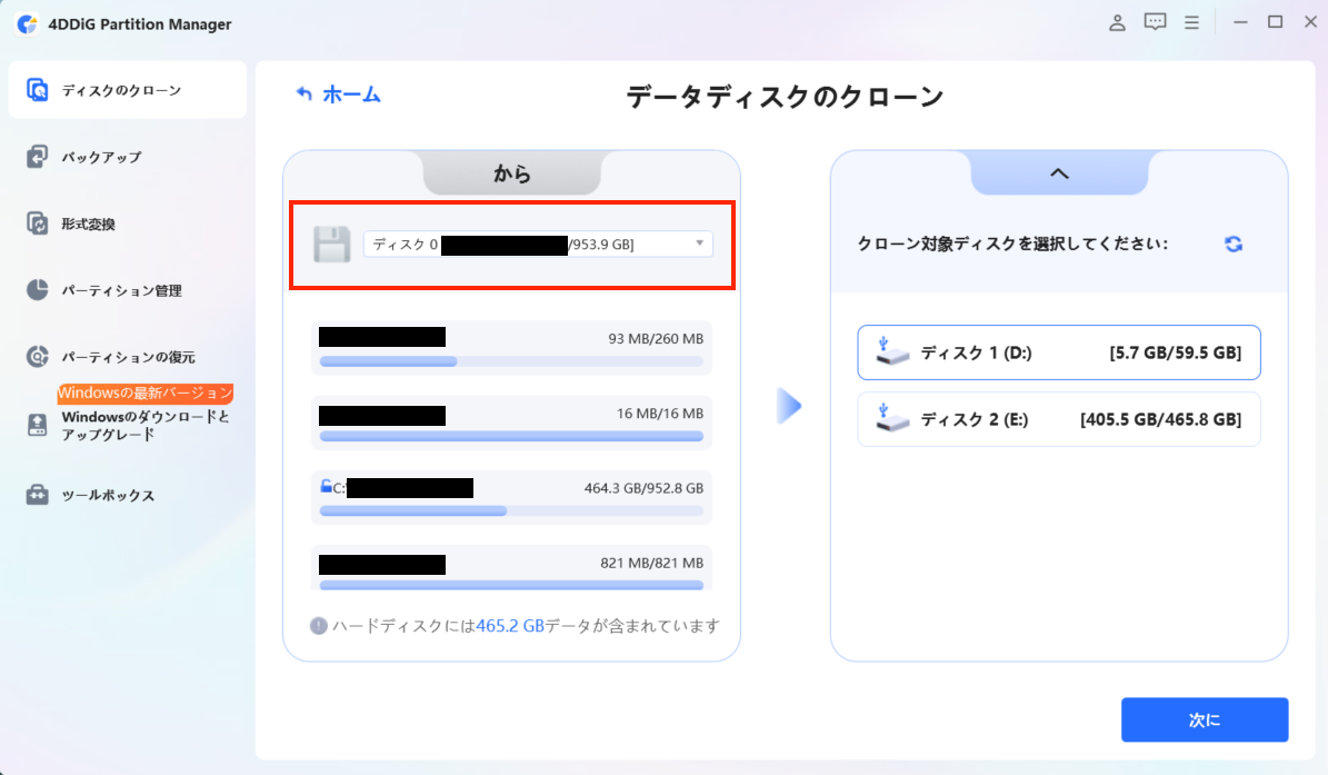 その後、右側でコピー先のディスク(SSDなど)を指定します。